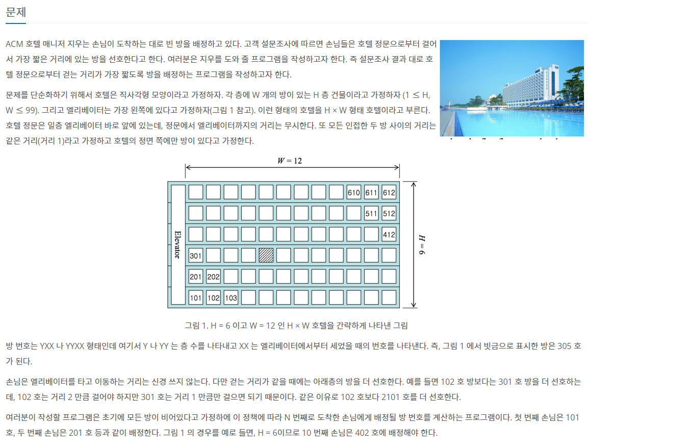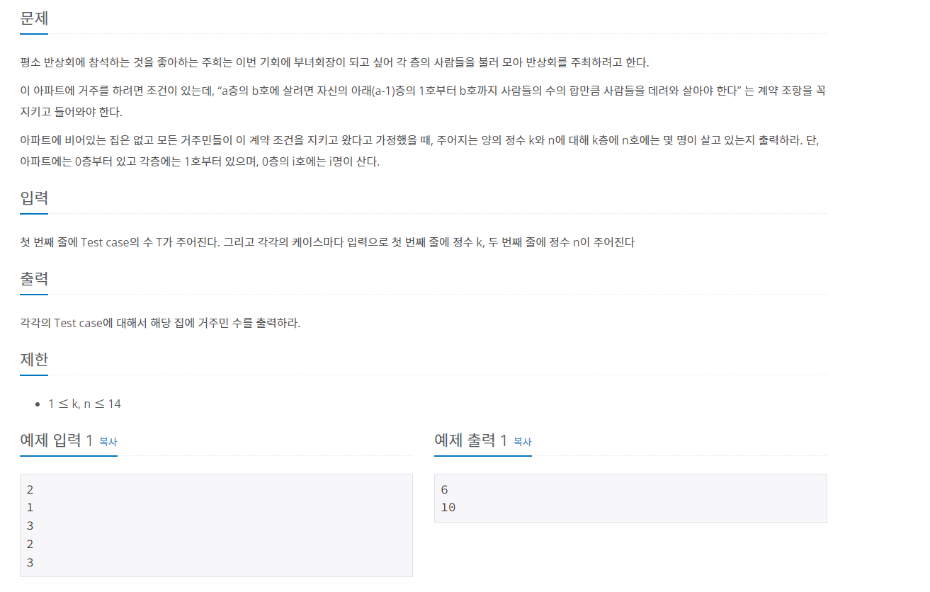 문제 풀이 해당 아파트 호수당 거주 인원을 표로 나타내면 다음과 같다. 해당 표를 통해 k층 n호에 거주하는 인원을 파악할 수 있는 규칙을 알 수 있다. K층 N호 = K층 (N-1)호의 인원 + (K-1)층 N호의 인원 인 것을 알 수 있다. 0층은 호수대로 거주하고, 모든 층의 1호는 1명만 거주하므로 위 법칙을 이용하여 K층 N호의 거주 인원을 구할 수 있다. 따라서 이를 코드로 구현하면 다음과 같다. import java.util.Scanner; public class Main { public static void main(String args[]){ Scanner scanner = new Scanner(System.in); int T; T = scanner.nextInt(); int[] k = ..
